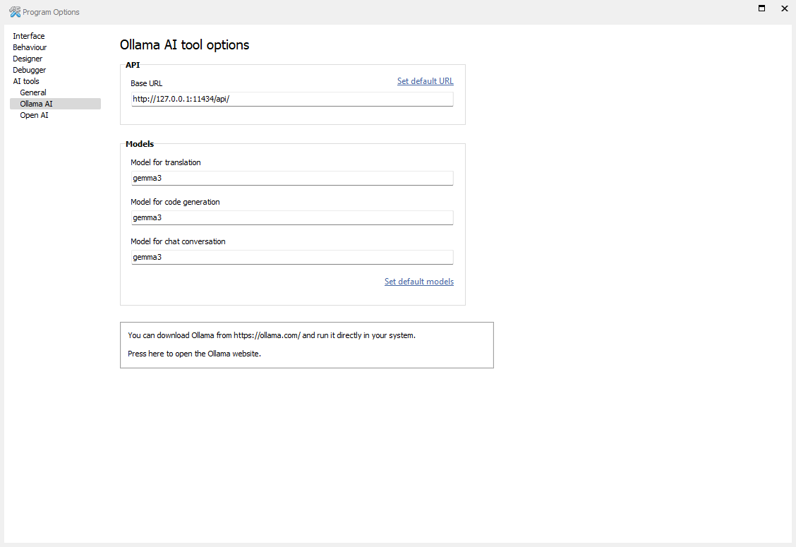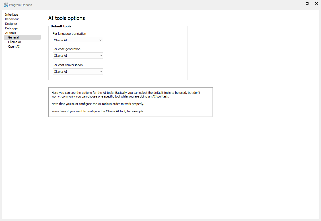 Below you can see the program AI tools - Ollama AI options window. After the image you can get information about all the program options in the AI tools - Ollama AI section.