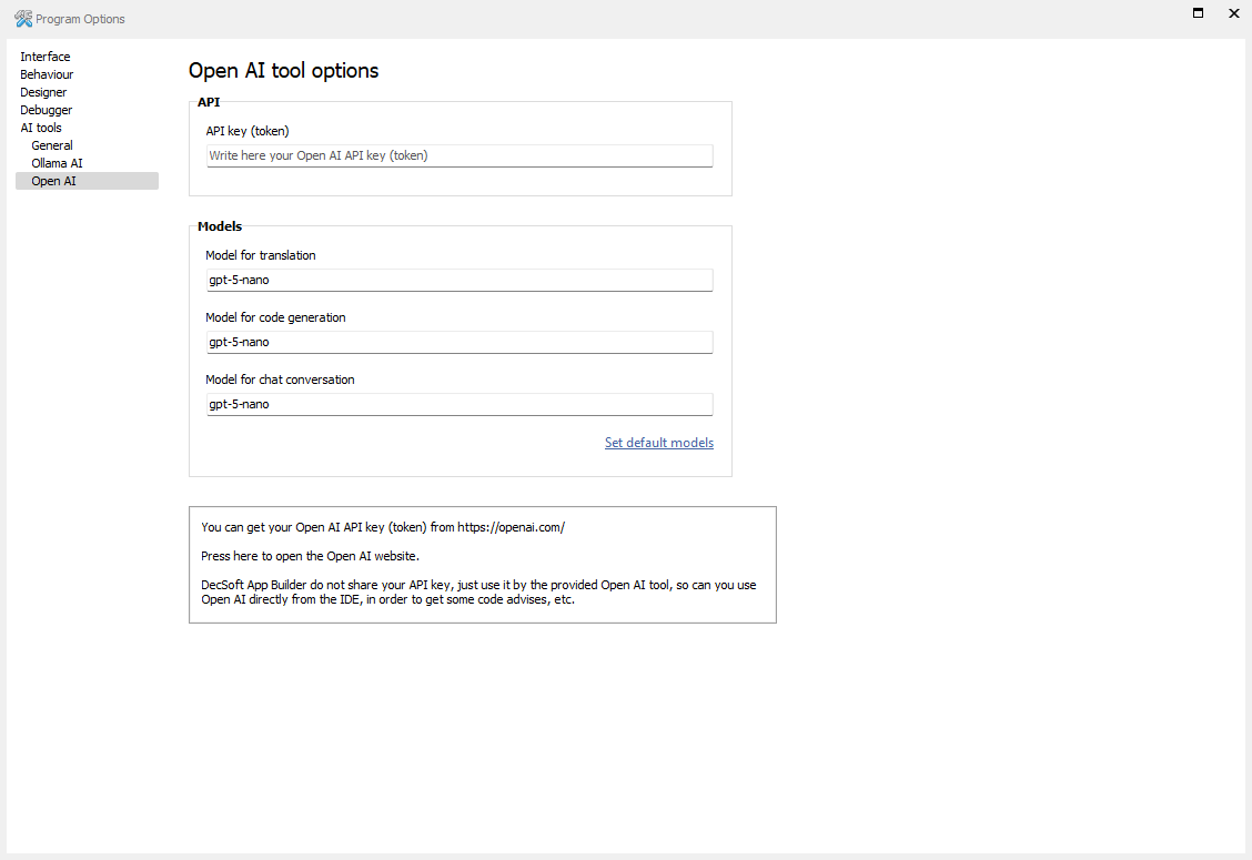 Above you can configure the Open AI tool. You must start to establish the Open AI API key (token) that you want to use. You can get an API key (token) from your account at the Open AI website from their website. Additionally, from these options you can establish the models to be used for the different AI tasks: translations, code generation and chat conversation. The default model is "gpt-4o", which works pretty well, but, if you want, you can set the model that you want to use for every AI task. Please, note that DecSoft App Builder never expose your Open AI API key (token). We only store it in the program configuration in your system.